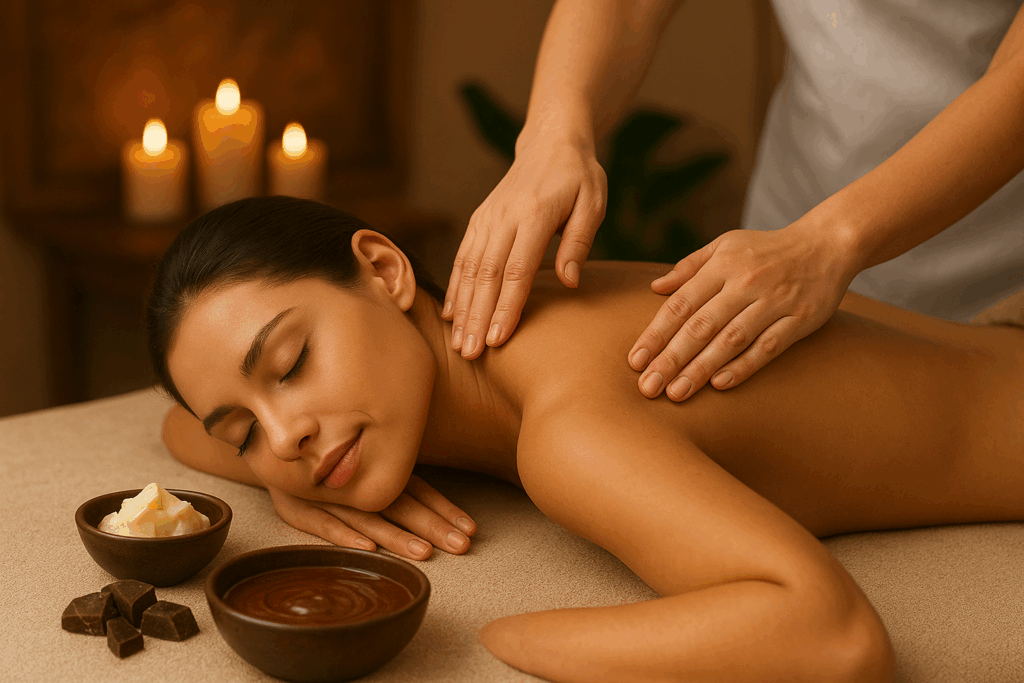 MASSAGE AU CHOCOLAT (corps entier) Un massage à base de beurre de cacao et d’huile d’amande douce parfumée au chocolat. L’odeur envoutante du chocolat, les vertus nourrissantes du beurre de cacao sur la peau et la douceur de l’huile d’amande douce. Un massage, qui comme le chocolat, viendra vous réconforter… (Evidemment, ce massage ne laisse aucun résidu sur la peau) Tarif : 60 min 60€/ 90 min 80€